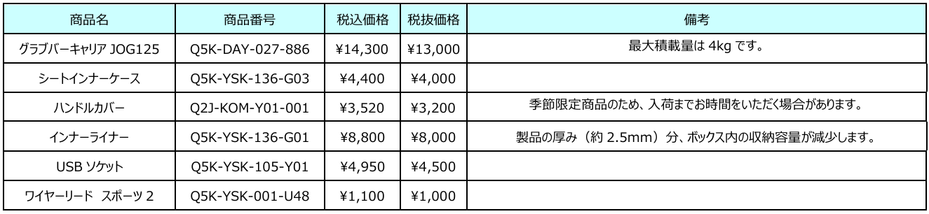 JOG ONE 新規設定アクセサリー及び、既存適合アクセサリーのご案内