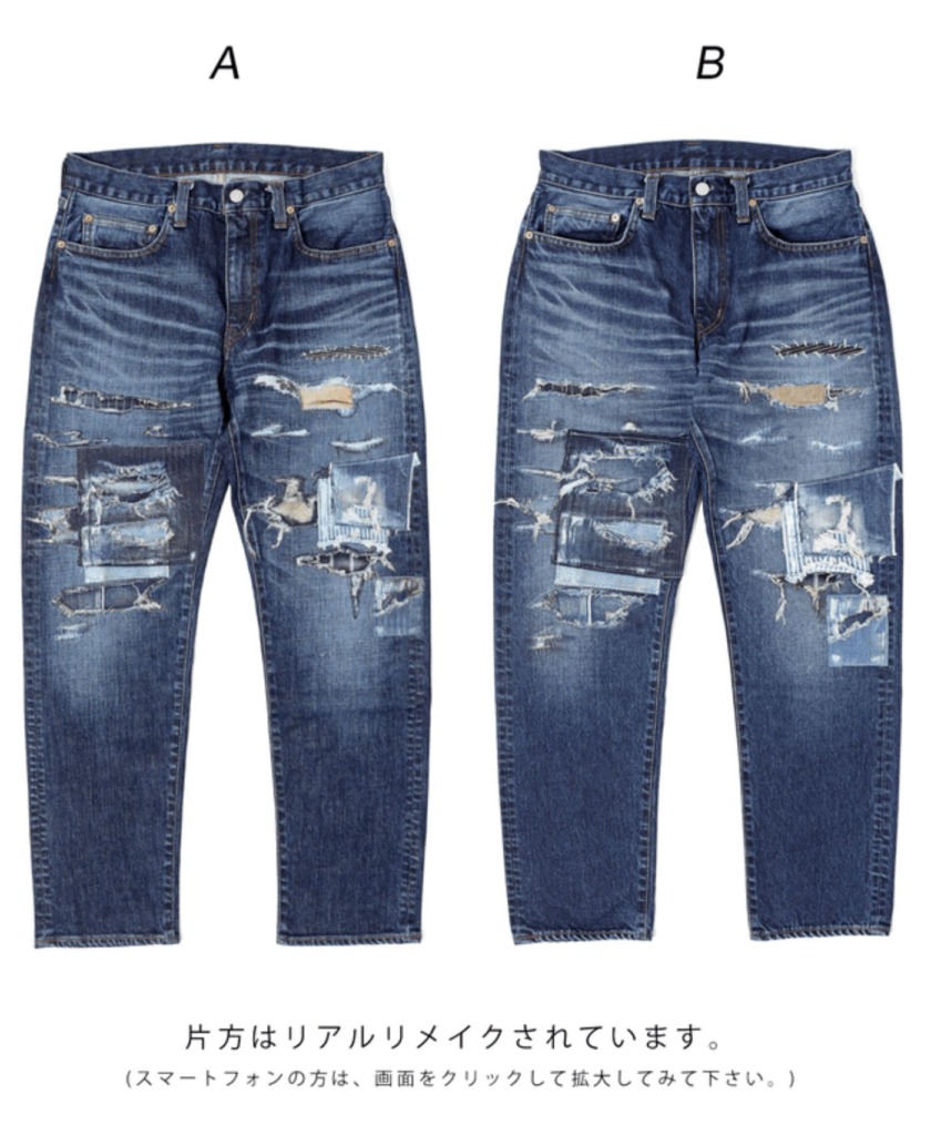 本来は1本1本が1点モノであり、趣のある作品とも言えるリメイクデニム。