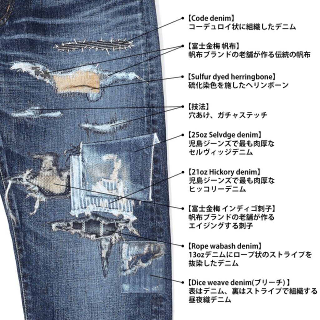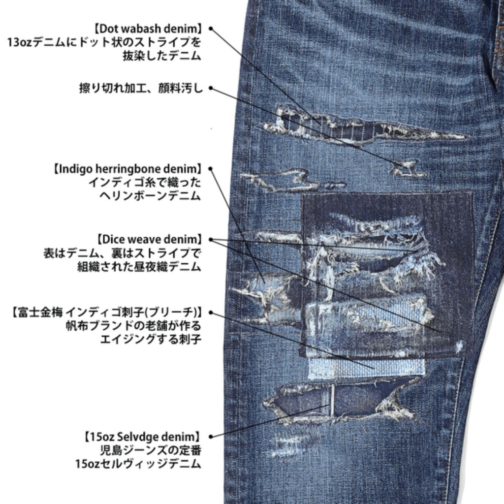 各生地ごとに難易度の高いダメージ加工とリペア加工を施したダウトデニムはこれまでに児島ジーンズが開発した生地の12種類と技術を一度に体感できる逸品だ。