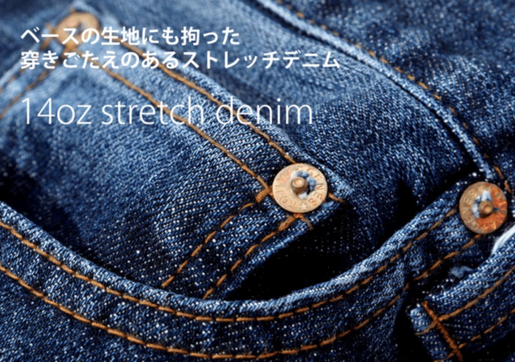 重視したのは最低限の快適性とデニムそのものの風合い。14ozの表面は綿100%を思わせるストラクチャーでザラ感が強い為、穿きごたえのあるストレッチデニムに仕上がっている。