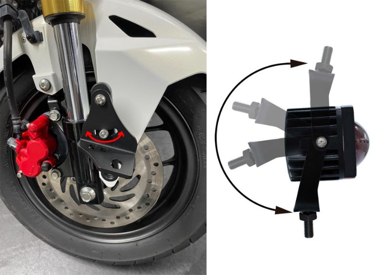 今回、ノーマルの車体で特に追加パーツを使用せず、取付けることにした。海外でフォグランプの装着場所として比較的多いフロントフォークのフェンダーブラケットのネジ穴を利用している。