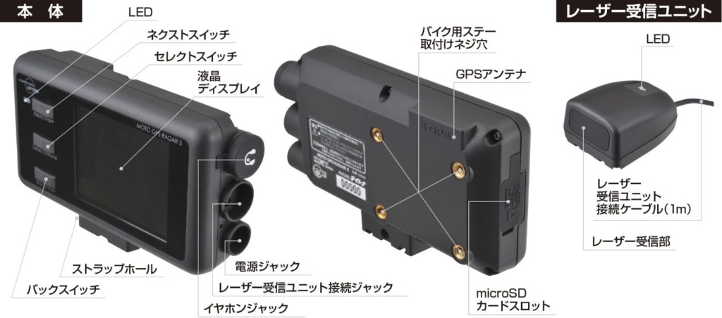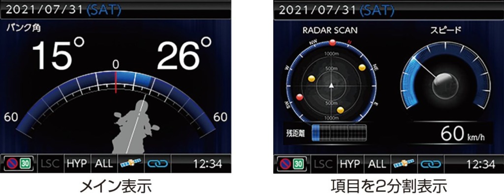 探知機としてはもちろん、加速度センサーを備えておりスピートメーター、バンク角、運転時間など、ツーリング時にあると嬉しい機能が備わっている。