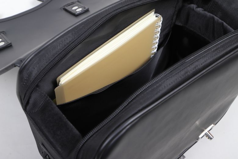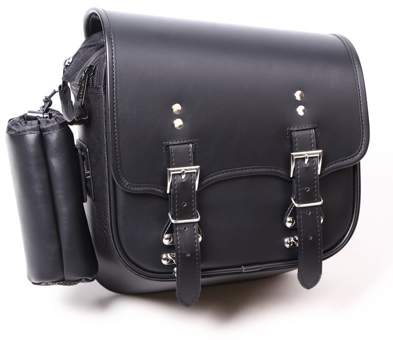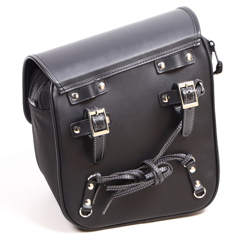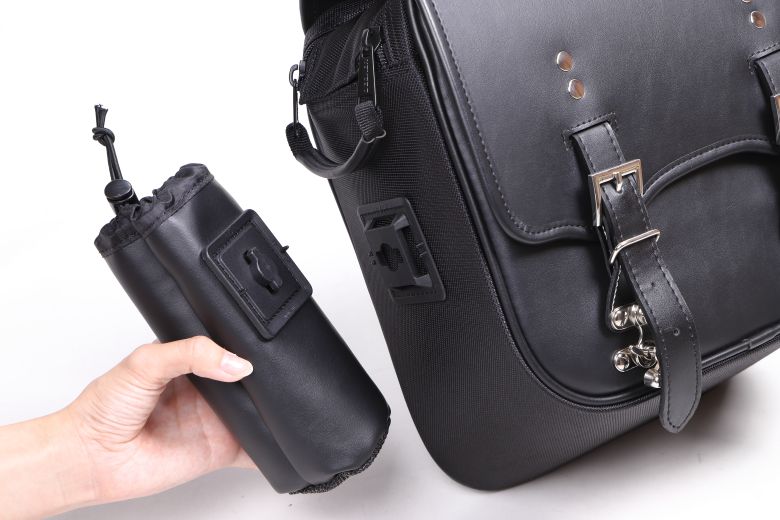 ナイロンと合皮のコンビネーションでメンテナンスフリー。バッグ底面を斜めに作る事によりコーナーなどでバイクを傾けた際にもバッグ底面が路面に摺りにくい構造で安全なライディングをサポートする。