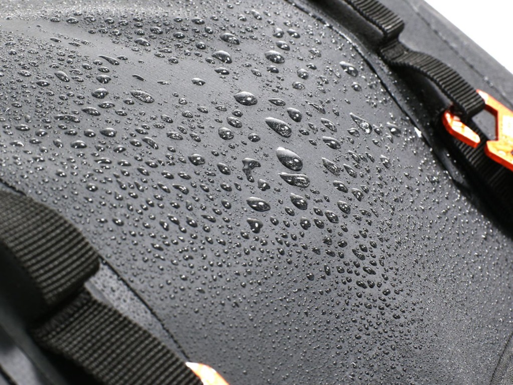 水でシミになる本革、泥が生地に入り込むナイロン生地と比べ、シミにならず泥にも強いターポリン素材を採用したサドルバッグ。レインカバー不要で急な雨でも荷物を守り、運転だけに集中することができる。