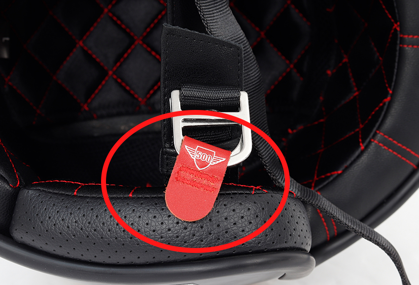 あごひものDリング部分に取り付けられた特徴的な赤いタグは、所有感を向上させる手の込んだ仕上がりです。
