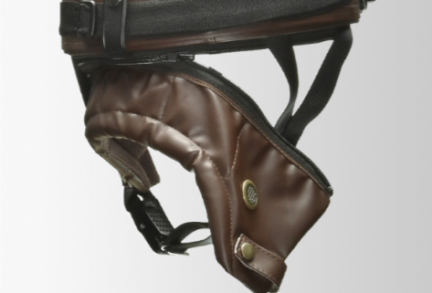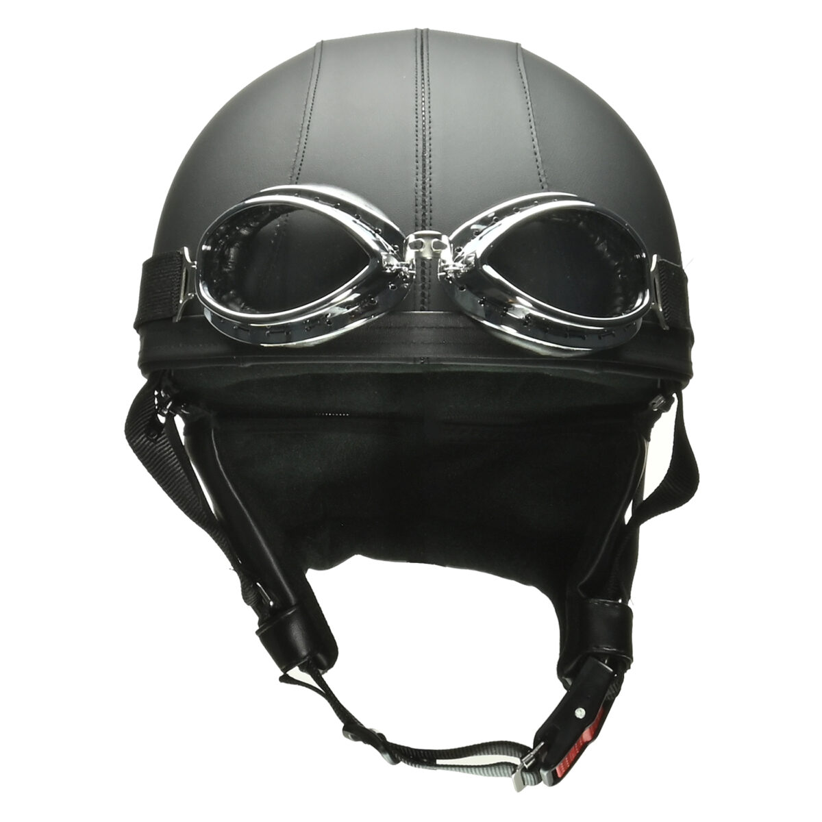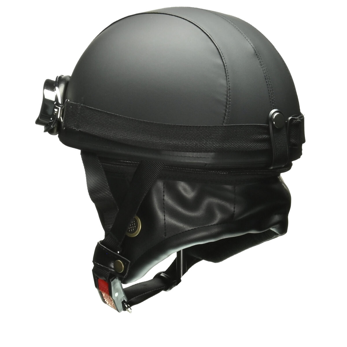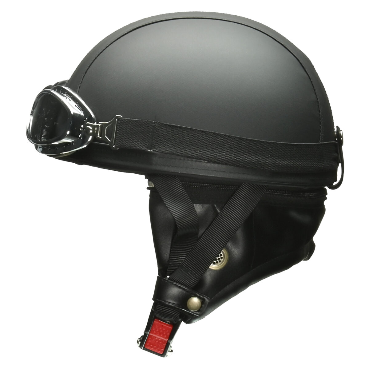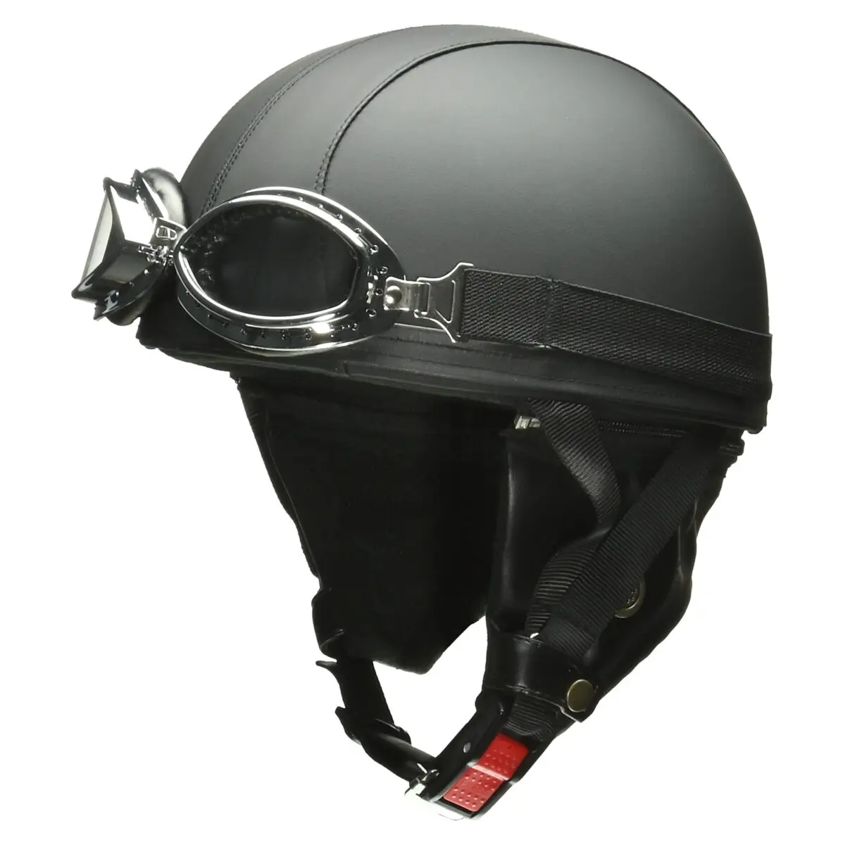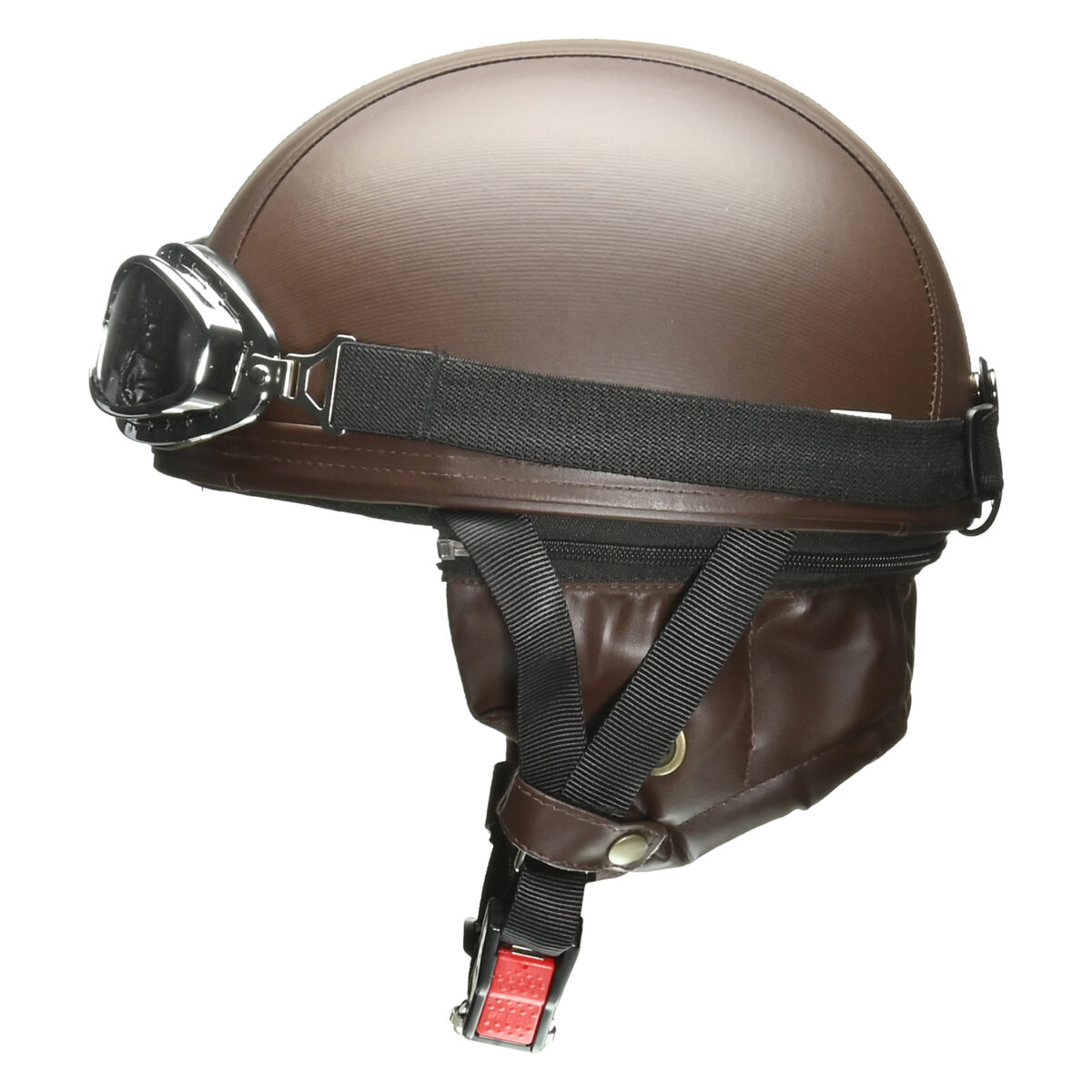 クラシカルなゴーグルを装着したイヤーカバー付レザーハーフヘルメット。ファスナー式イヤーカバーは季節や用途に応じて容易に着脱可能。カラーは定番のブラック、ブラウン、の2色展開。ビンテージやレトロな雰囲気のバイクによく似合います。