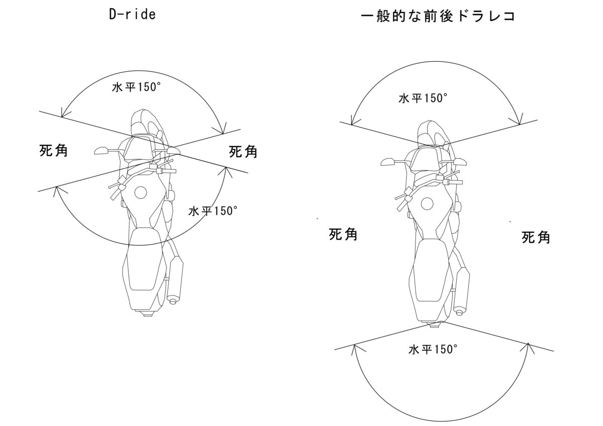 また同社の誇る圧倒的死角の少なさも併せて紹介してほしいとのこと。左はD-rideの撮影カバー範囲で、右が一般的な広角ドラレコを取り付けた場合の画角だそうだ。(DR-05CP・DR-05BP共通)