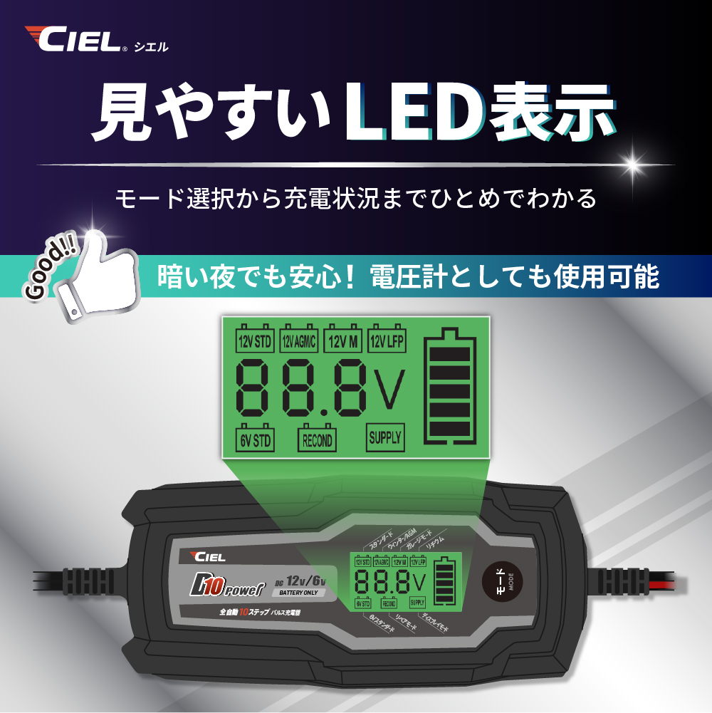 全自動 10 ステップサイクル充電でバッテリー毎に適切な充電、メンテナンスを行います。