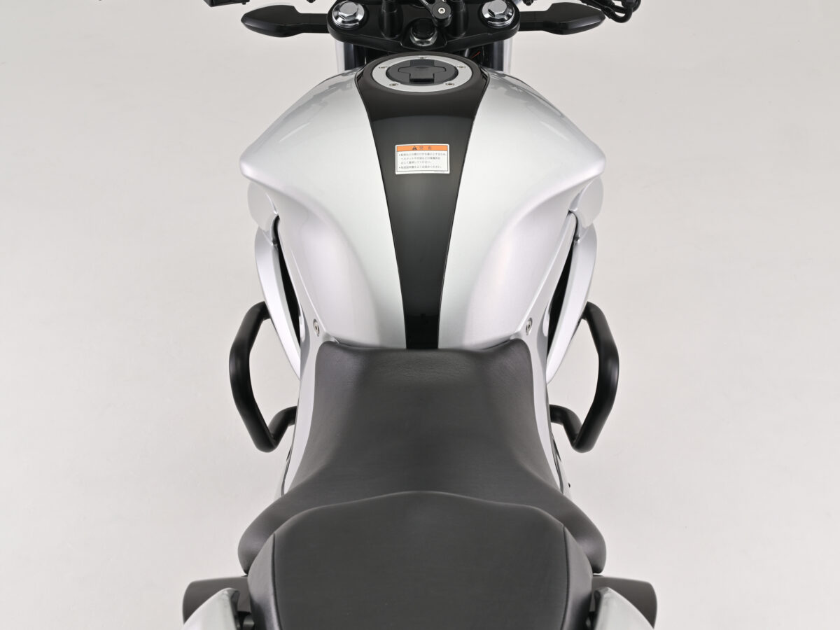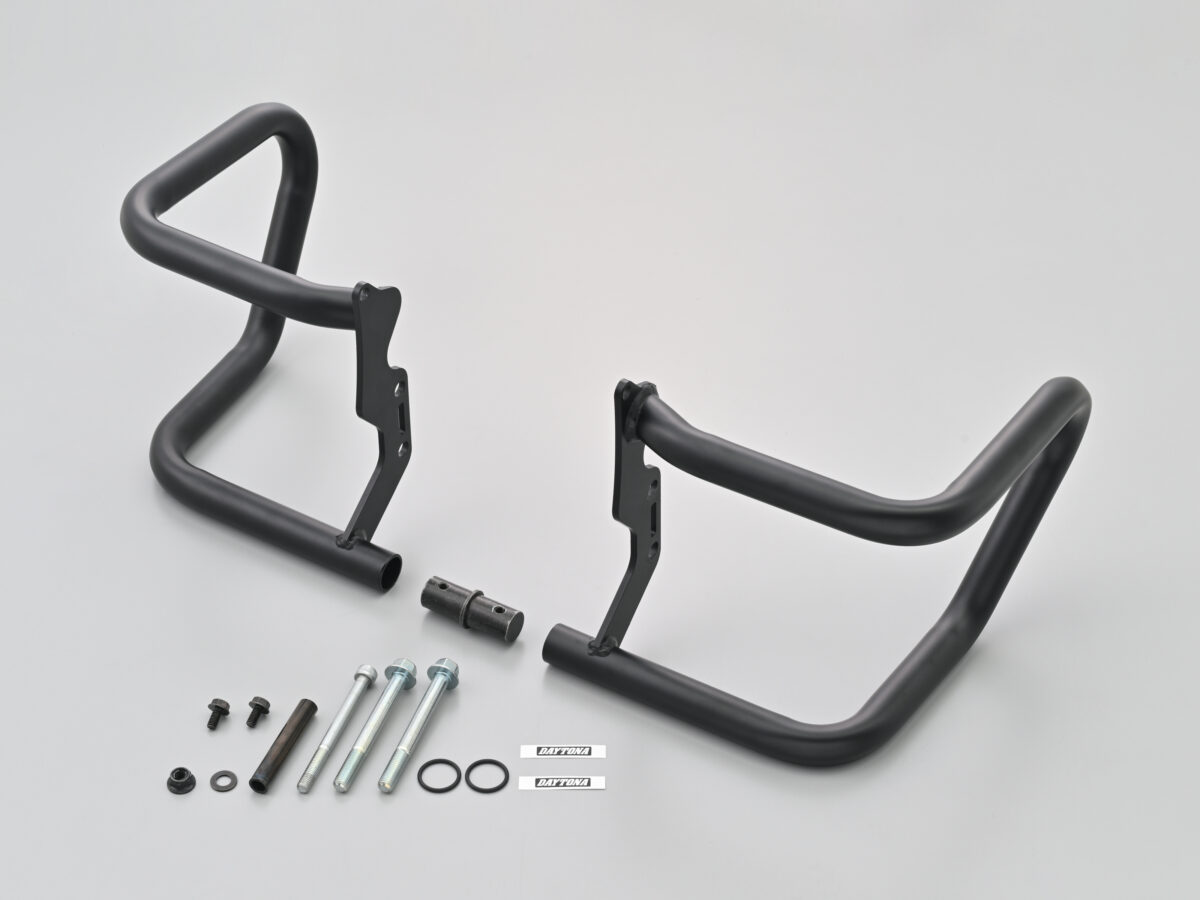 不慮の転倒の際、ライダーや愛車へのダメージを軽減させるエンジンガード。装着にマフラーの脱着は不要です。