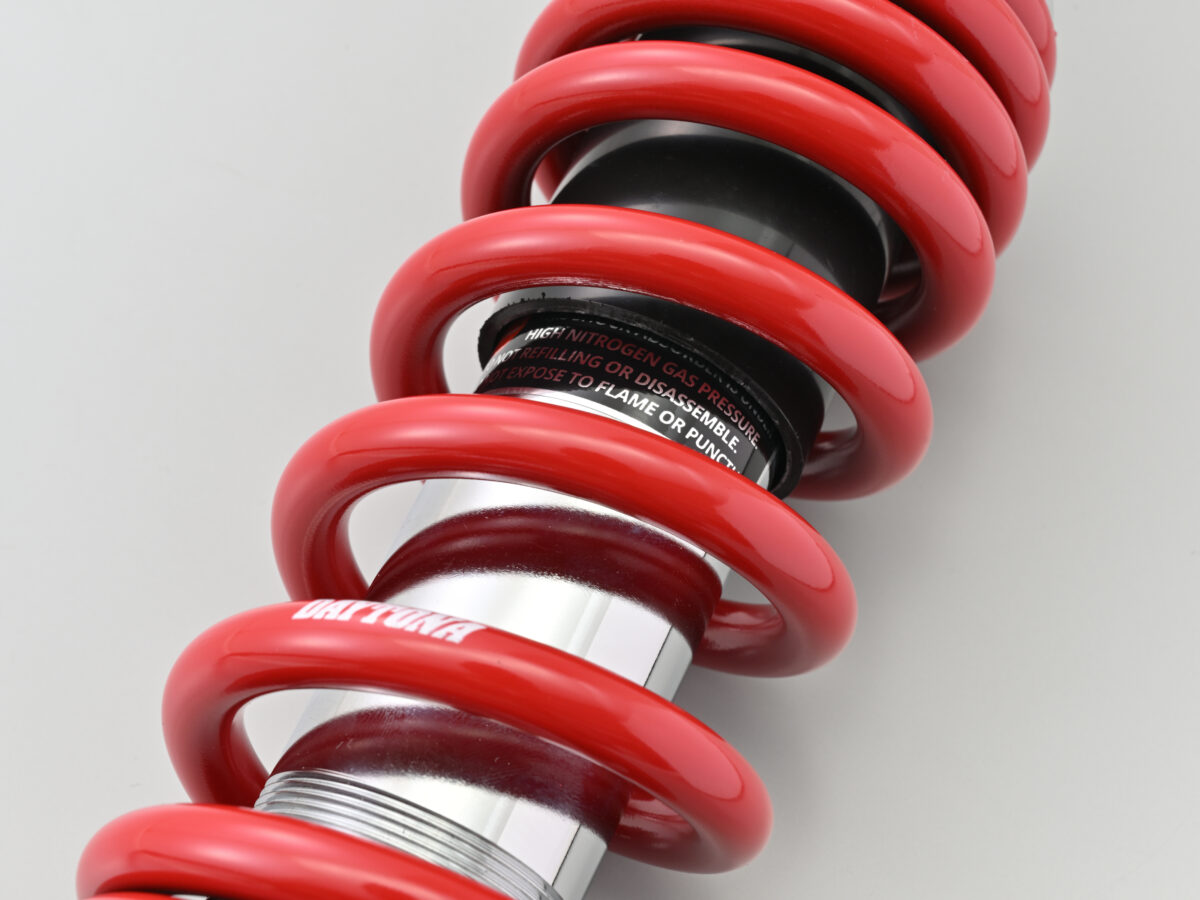ノーマルサスペンション取付長をロング化(320→330mm)し、有効なサスペンションストロークを確保。サスペンションストロークを伸ばしたことにより、初期作動はギャップ吸収性が向上し、素晴らしい路面追従性を実現。サスペンションストロークの奥でもしっかりと踏ん張る絶妙なバネレートと減衰特性に設定し、スポーツ走行や高速走行等高荷重がかる状況でもノーマルをはるかに超える安定性を発揮します。