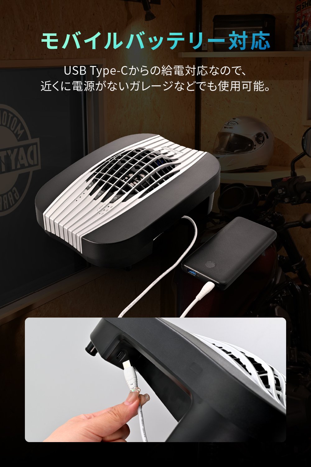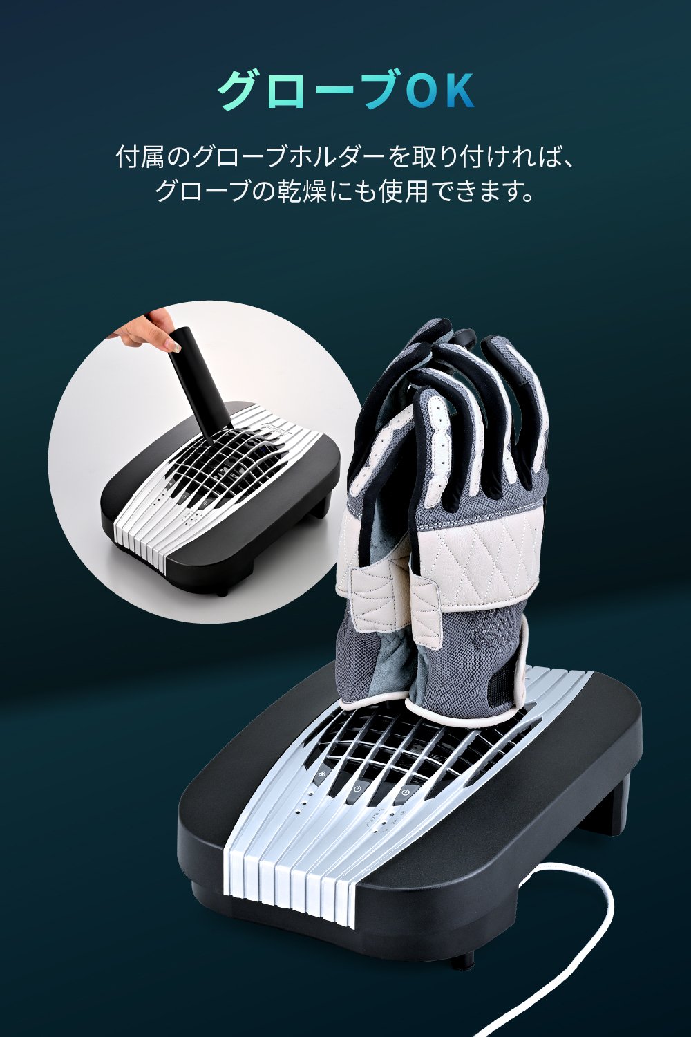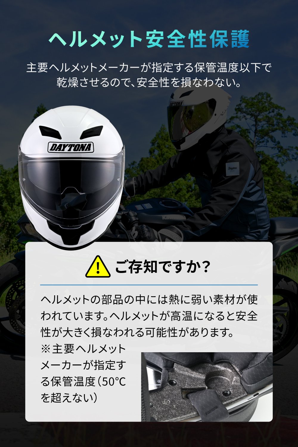 ・主な機能:大風量&大開口 / プラズマイオン消臭 / 各種ヘルメット対応 / グローブ・フットウエア対応 / モバイルバッテリー給電対応 / オート乾燥・消臭機能 / 風量調整 / タイマー機能