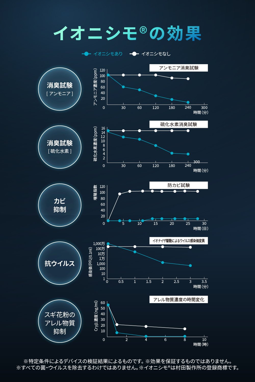 村田製作所の開発したイオニシモを採用。プラズマ放電によりイオンとラジカル活性種を放出し、カビ菌・アレル物質を酸化分解。