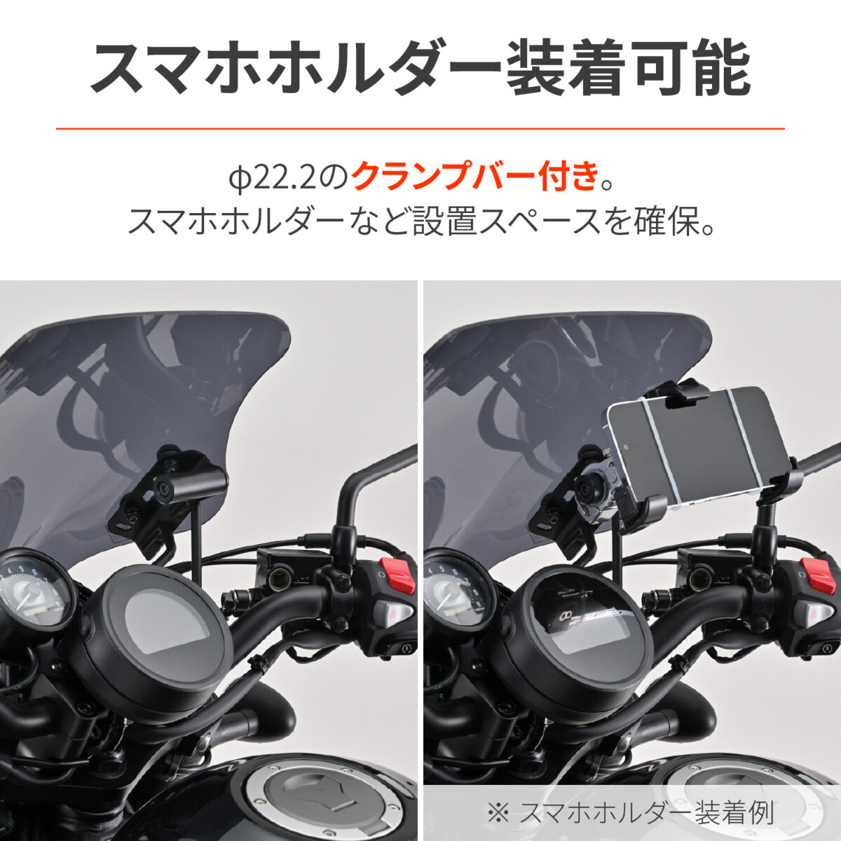 付属のクランプバーを装着すれば、市販のΦ22.2パイプ用クランプが使用可能。スマートフォンなどのデジモノ装着に最適です。