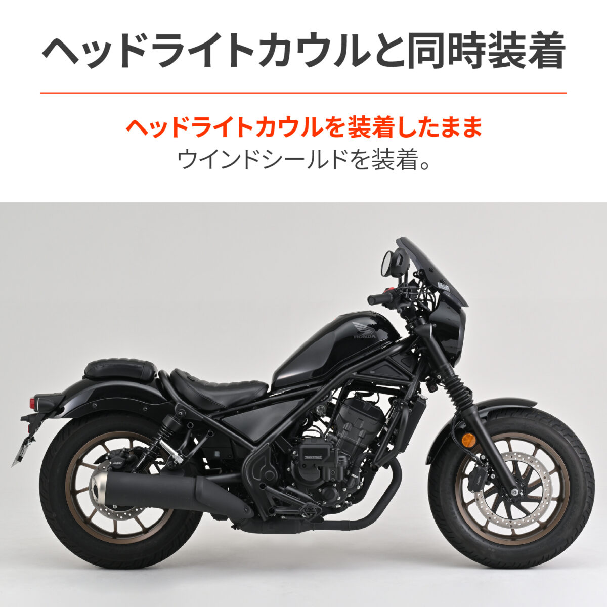 ※Rebel250(標準車)は、純正ヘッドライトカウルをマウントするブラケットがないため取付不可。