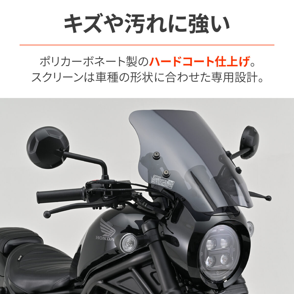 ウインドシールドは耐衝撃に強いポリカーボネートを採用。傷や汚れに強いハードコーティング仕様でクリアーな視界を長期にわたり確保。