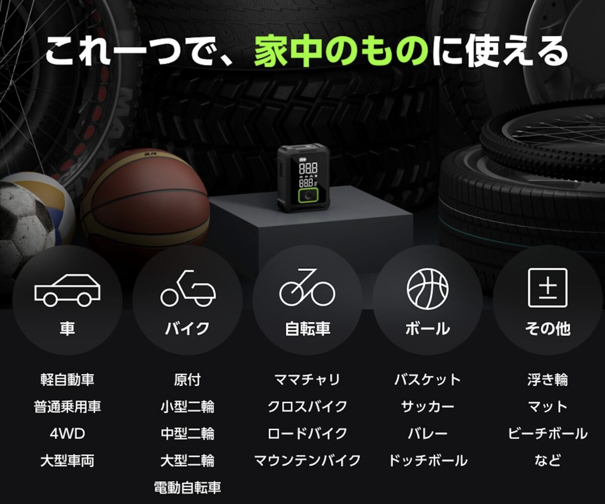 付属のアタッチメントを使えば、車以外にもバイクや自転車、ボールや浮き輪にマットなど、家中にあるあらゆるものに空気を入れることができます。