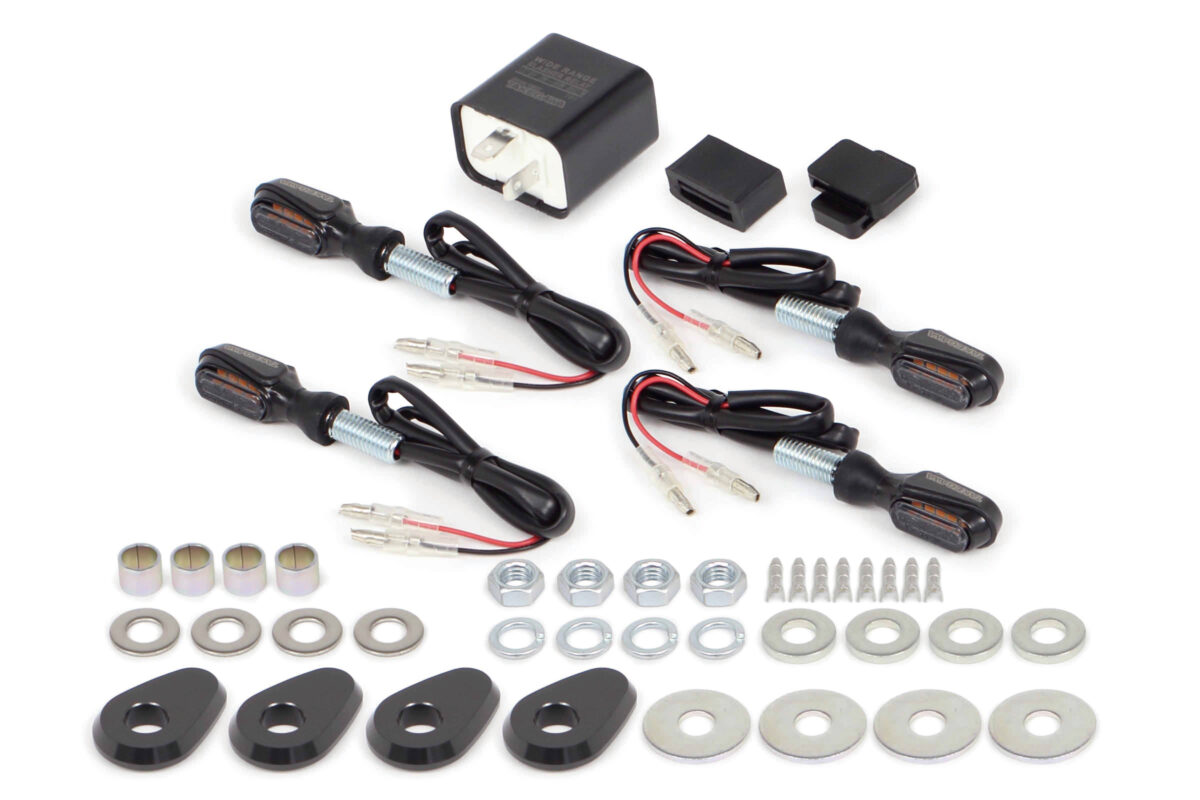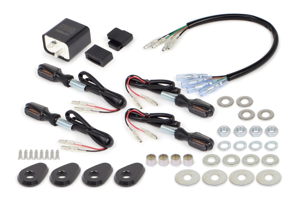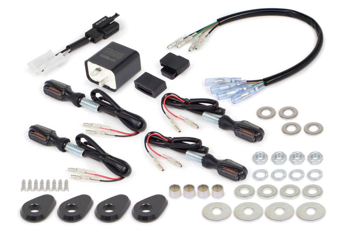 車両専用キットは、ストリームラインミニLEDウインカー(4個)にワイドレンジフラッシャーリレー(1個)、リレーコード(1個)、ハーネスCOMP.(1個)、ブラケット(4個)、スペーサー(4個)、プレーンワッシャー(厚み2.6mm×4個)、オスギボシ(8個)が付属しています。
