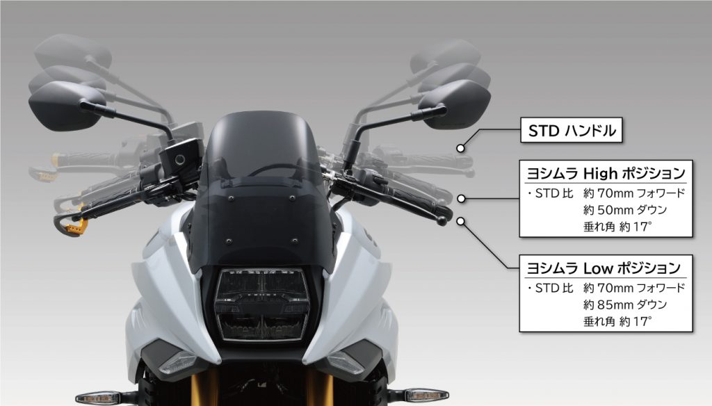 | スペック (STD比) | 約70mm 前方 / 約85mm 下方(参考値) ※Lowポジションへの変更には、別途ヨシムラ製タンクカウルが必要です。(発売予定) |