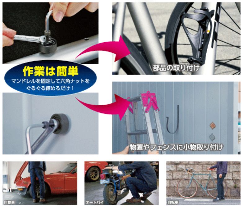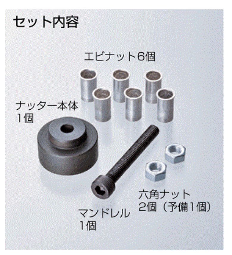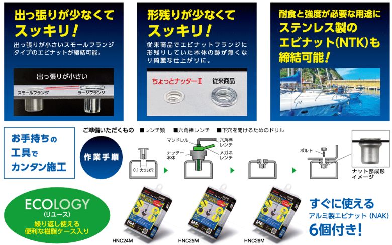 母材にネジ穴を生成することができるブラインドナットを、専用工具なしで取り付けることが可能な便利セット。従来品「ちょっとナッター」に比べて使用可能なナットの範囲が大幅に広がった。(アルミ製・ステンレス製・スモールフランジタイプ等)