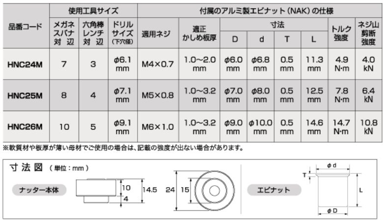 品番 (使用範囲):HNC24M (M4用)、HNC25M (M5用)、HNC26M (M6用)
