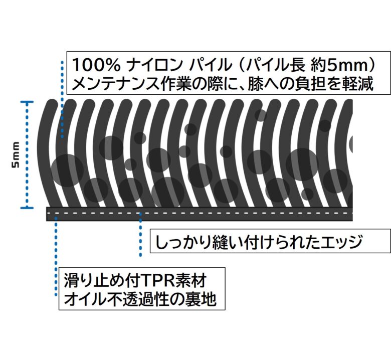 100%ナイロンパイル素材を使用した表地は耐油性・耐久性に優れ、TPR素材を使用した不透過性の裏地は、オイルを通さず床や地面への悪影響を防ぐ。