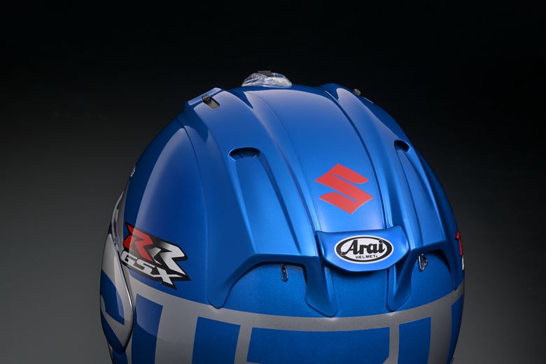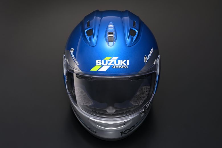 同帽体は、2020年11月のMotoGPにて先んじてお披露目されていたもので、往年のスズキワークスカラーを彷彿とさせる配色に、サイドにはワークスマシンと同じ“GSX-RR”のロゴが配された特別デザインの記念ヘルメットだ。生産数は100個のみで、その内国内販売分は30個のみ(M・L・XLサイズ各10個)。