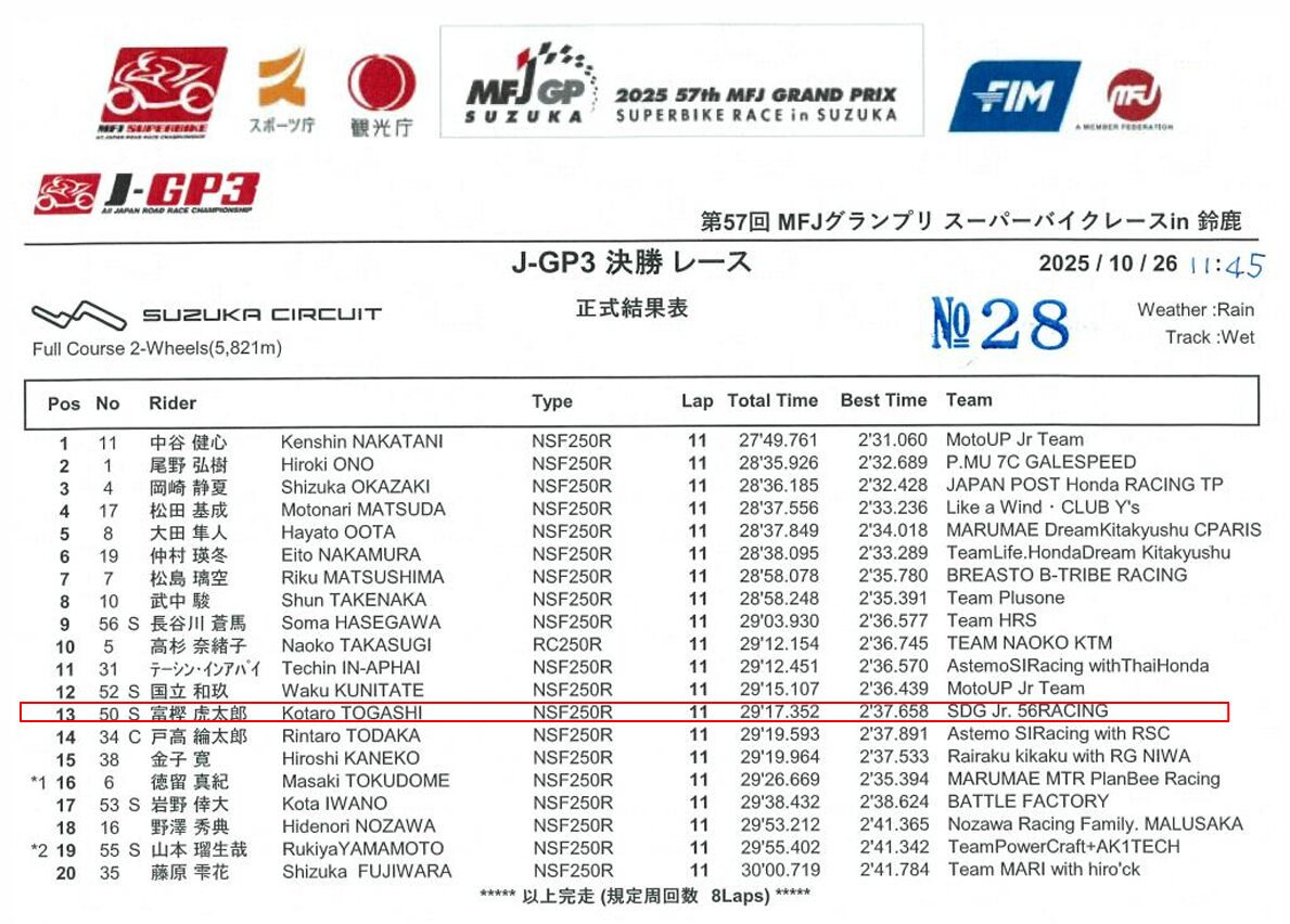 56racingは、2025年全日本ロードレース選手権第7戦MFJ-GPにおいて、J-GP3クラスに参戦する富樫虎太郎選手が雨の決勝レースを13位で完走したと発表した。
