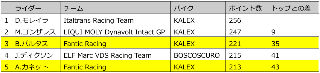 ファンティック・レーシングにとっては、ポジティブな結果となった。チームランキングでは依然としてトップを守り、残り2戦でランキング2番手のリキモリ・ダイナボルト・インタクトGPに対して、54ポイント差を築いている。2週間後となる次戦のポルトガルGPでは、初のチームタイトル獲得に向けて、“マッチポイント”を迎える可能性がある。
