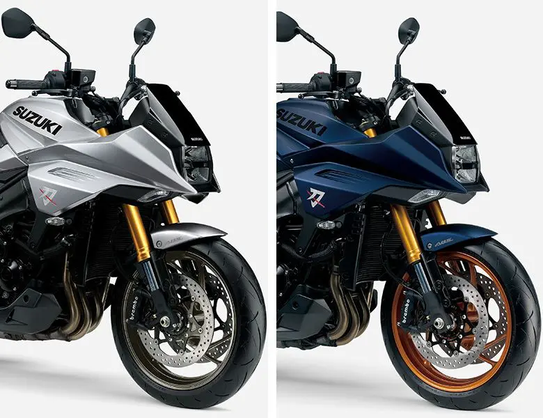「KATANA」は、燃料タンクから車体先端まで、研ぎ澄まされた刀のようにシャープで流れるようなラインをあしらったデザインを採用。角形のLEDヘッドランプや、刀の切先をイメージした造形の車体先端下部に装着されたLEDポジションランプにより、「GSX1100S KATANA」に着想を得た特徴的な顔つきに仕上げた。また、スズキ初となるターンシグナル付スイングアームマウントリヤフェンダーを採用し、車体後部のシート下をすっきりとさせた外観となっている。