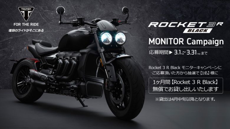 トライアンフモーターサイクルズジャパン株式会社は3/1から3/31までの期間中、Rocket 3 R Black モニターキャンペーンに応募した人の中から抽選で【1名】に、1ヶ月間【Rocket 3 R Black】を無償で貸し出しをする。