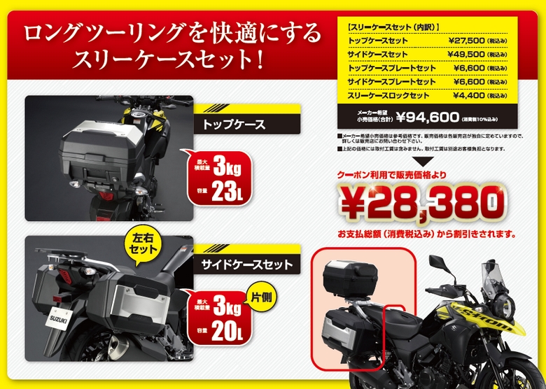 内容:キャンペーン期間中に、キャンペーン実施店にてVストローム 250 ABS (国内認定新車) を購入し、10月7日(金)までに登録を完了したお客様を対象に、スリーケースセット(純正用品)を同時購入する際、支払い総額から28,380円割引される「スリーケースセット(純正用品)購入サポートクーポン」がプレゼントされる。