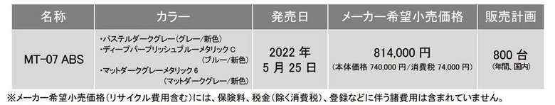 ヤマハ発動機株式会社は、ロードスポーツ「MT-07 ABS」の2022年モデルを5月25日に発売する。