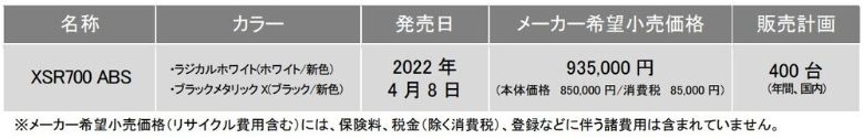 ヤマハは「XSR700 ABS」のマイナーチェンジを行い、2022年モデルとして2022年4月8日(金)から販売を開始する。