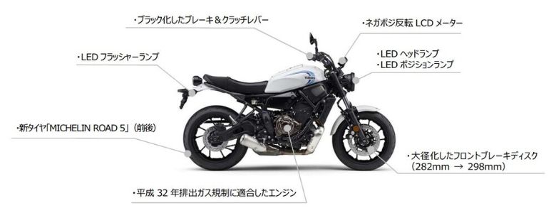 平成32年排出ガス規制に適合する新しいXSR700には、灯火類のLED化、新タイヤ「ミシュランロード5」の採用、フロントブレーキディスクの大径化(282→298mm)などの変更が加えられており、ライディングがさらに楽しく感じるモデルに仕上がっている。