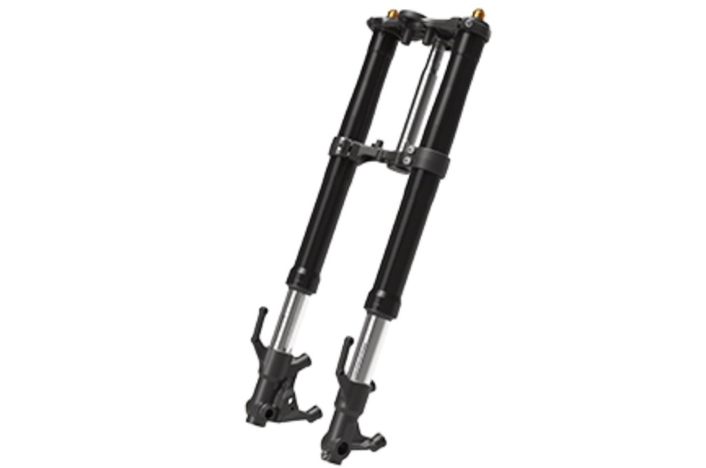 新設計Φ41mmインナーチューブの倒立式フロントサスペンションを採用。旋回時、制動時などでの良好なフロント接地感をもたらす。減衰力とばね定数を最適化し、車体挙動の分かりやすさ、ワインディング路やショートサーキットでの操縦性などを主眼にセッティングしている。