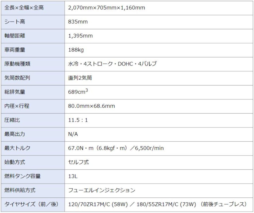 ■米国仕様「YZF-R7」主要仕様諸元
