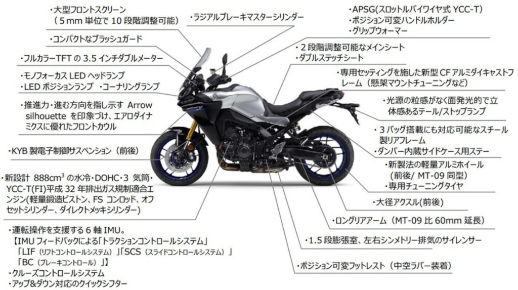 「MT-09 ABS」が持つ凝縮感のあるプラットフォームをもとに、スクリーン、フロントカウル、ブラッシュガードなど最適なウインドプロテクションのための機構をコンパクトにまとめ、専用設計した灯火器の採用で、旅のための機能を最優先にしたデザインとしている。