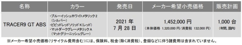 ヤマハ発動機株式会社は、高いスポーツ性能と実用機能を備えたスポーツツーリングモデル「TRACER9 GT ABS」を7月28日に発売する。