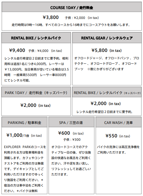 ●参加費:¥9,900/ 1名(税込、キャンプサイト1泊利用料と2日間の走行料含む)
