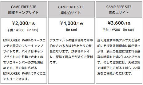 ※今年から駐車場料金を頂戴しますがテントや食事などのデイキャンプは無料になりました。ご自