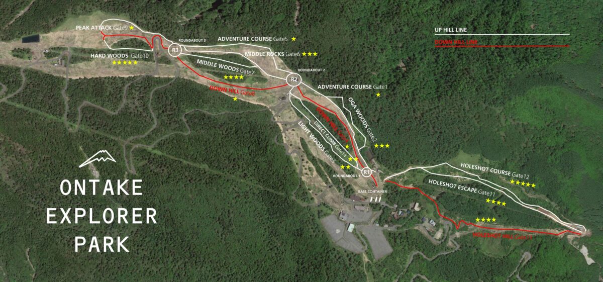 ど多彩な14本のコースを展開。難易度を★で表記、★1~3はトレールバイクやアドベンチャーバ