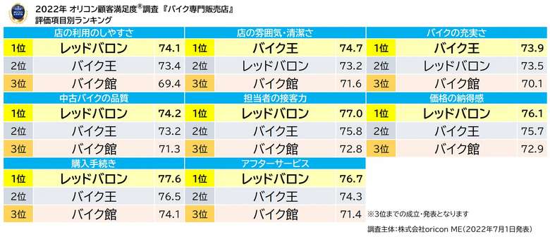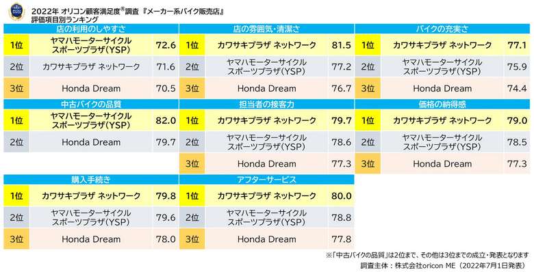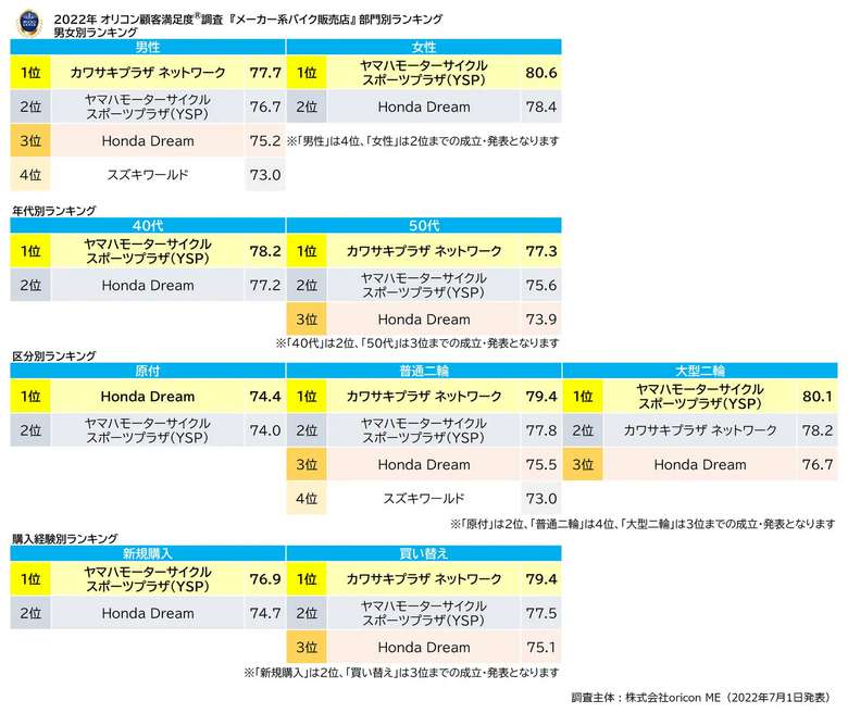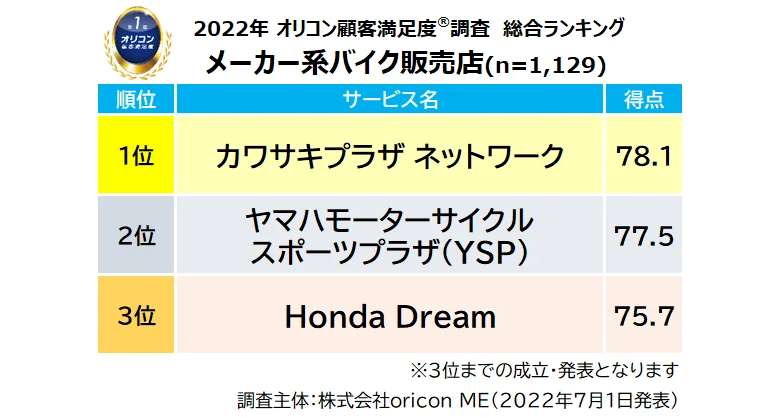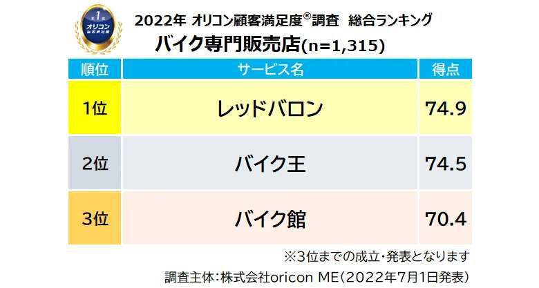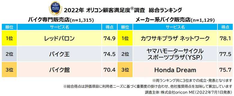 このようなバイク需要を受け、実際のサービス利用者を対象に第三者の立場で顧客満足度調査を実施する株式会社oricon ME は、『バイク専門販売店』『メーカー系バイク販売店』についての満足度調査を初めて実施し、2022年7月1日(金)にその結果を発表した。結果は、以下の通りとなっている。