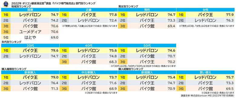 また、男女別の「男性」では【レッドバロン】、「女性」で【バイク王】がそれぞれ1位、購入種類別の「新車購入」では【バイク王】が、「中古車購入」では【レッドバロン】がそれぞれ1位になるなど、2社が評価を分ける結果となった。