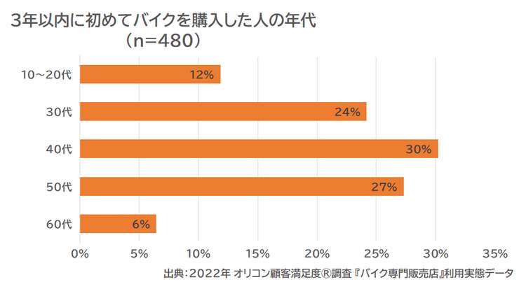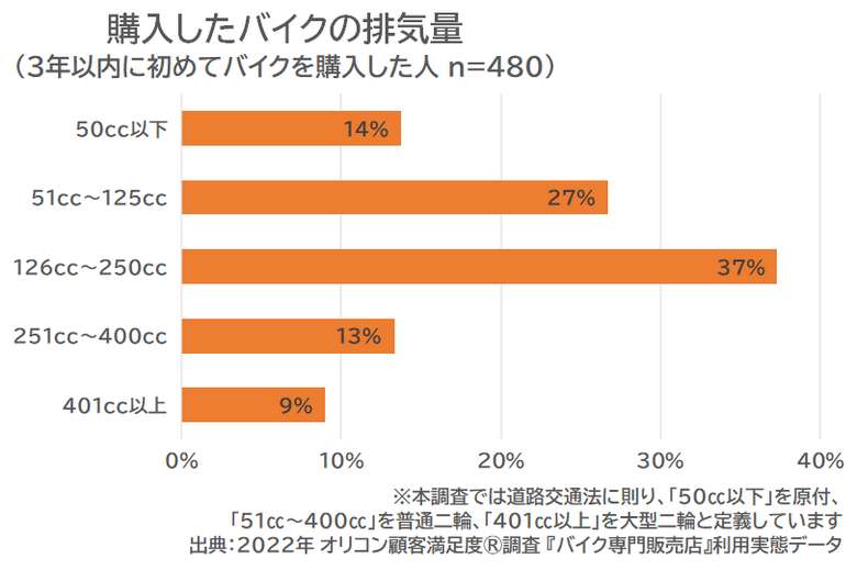 3年以内にバイクを購入した人のうち、「バイクを初めて購入した人」は37% 年代は「40代」が30%、排気量は「126~250cc」が37%で最多