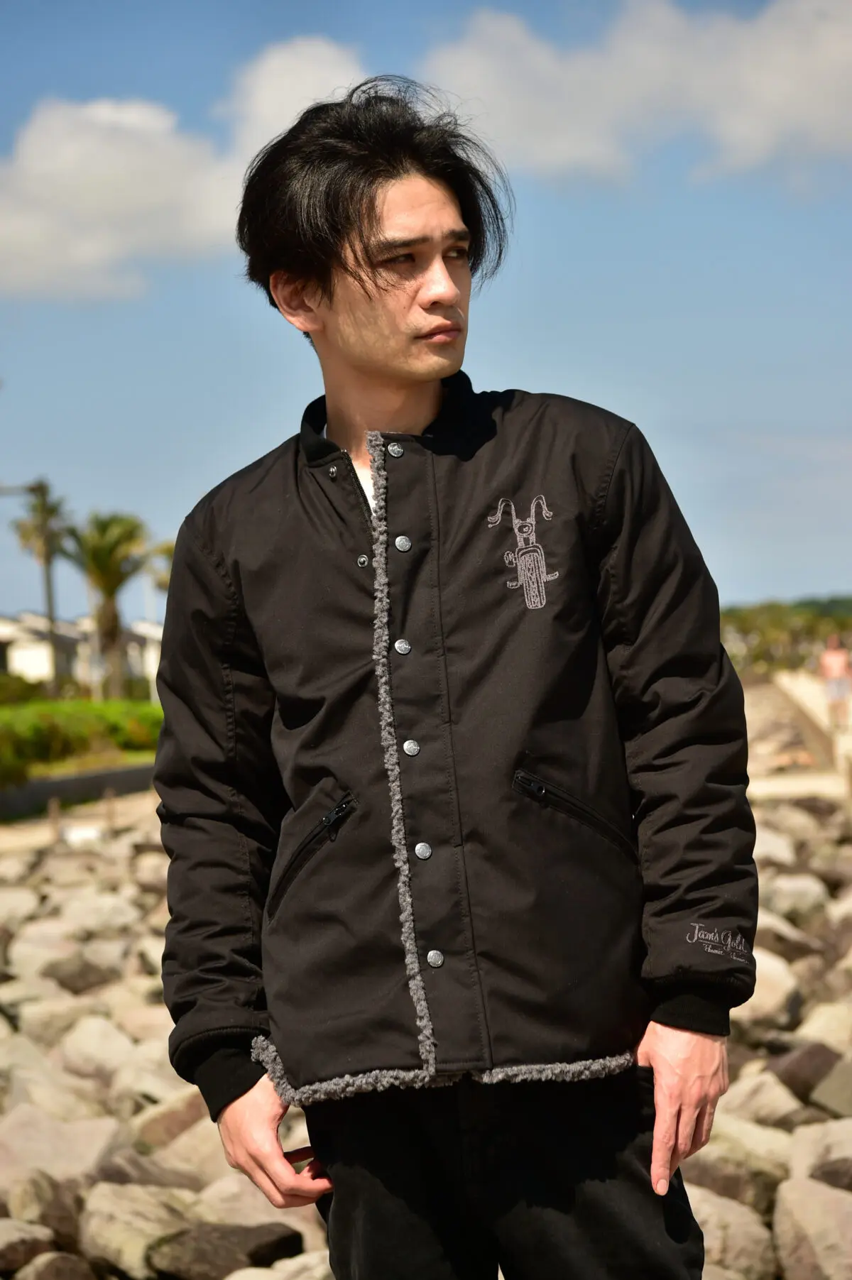 まずは「JAM’S GOLD JUGGLER」A面はバイカー風コーチジャケット。胸には味わいあるチョッパーがプリント。背中には〈STAY NARUER〉のメッセージ。Bサイドは一転アウトドアで人気のフリース素材。もちろんバイク用アウターなので防寒やパット装備と仕様は万全だ。