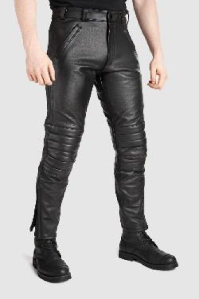 1.2㎜のカウハイドを使用したPandoMoto初のレザーパンツ。サイドと腰にストレッチパネル(シャーリング)を施し、機能性/運動性を両立。クラシックなデザインをスリムにシェイプし、さらに裾に独特の鎧風デザインを調和させ、現代のファッションに仕立てた。CEのAAA規格をクリアし、D3O Ghost ニー&ヒップアーマーを付属。