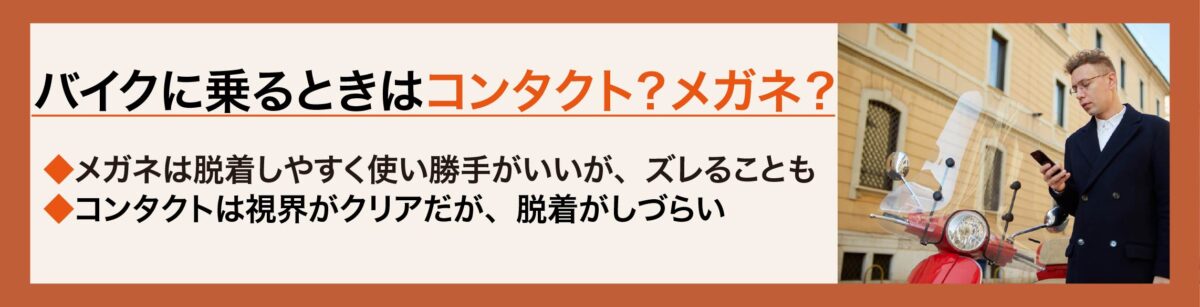 では、バイクに乗るときに「コンタクト」と「メガネ」にそれぞれどのような特徴があるのでしょうか。