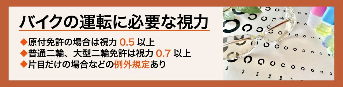 バイクに乗るためには、運転技術だけでなく「視力」も重要な条件のひとつです。