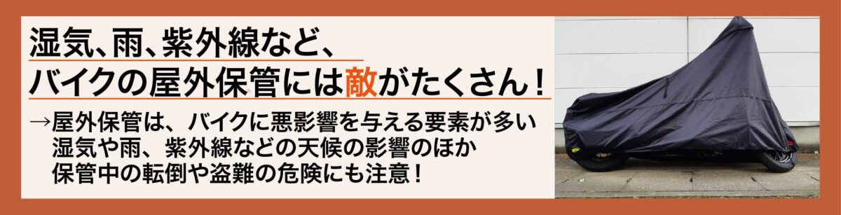 上述の通り、屋外でバイクを保管する場合、劣化や転倒、盗難などのリスクが多く存在します。