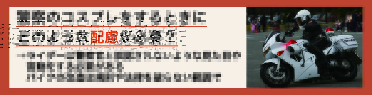 また、どうしても白バイを再現したい場合、そのバイクの使用をイベント会場など公道外に限定するとよいでしょう。